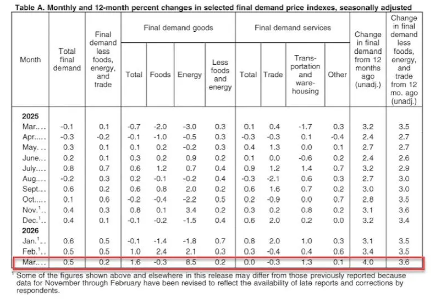 核心PPI表现同样温和。剔除食品和能源的核心PPI环比仅上涨0.1%,远低于预期的0.5%及前值的0.5%;同比上涨3.8%,较前值3.9%小幅回落。